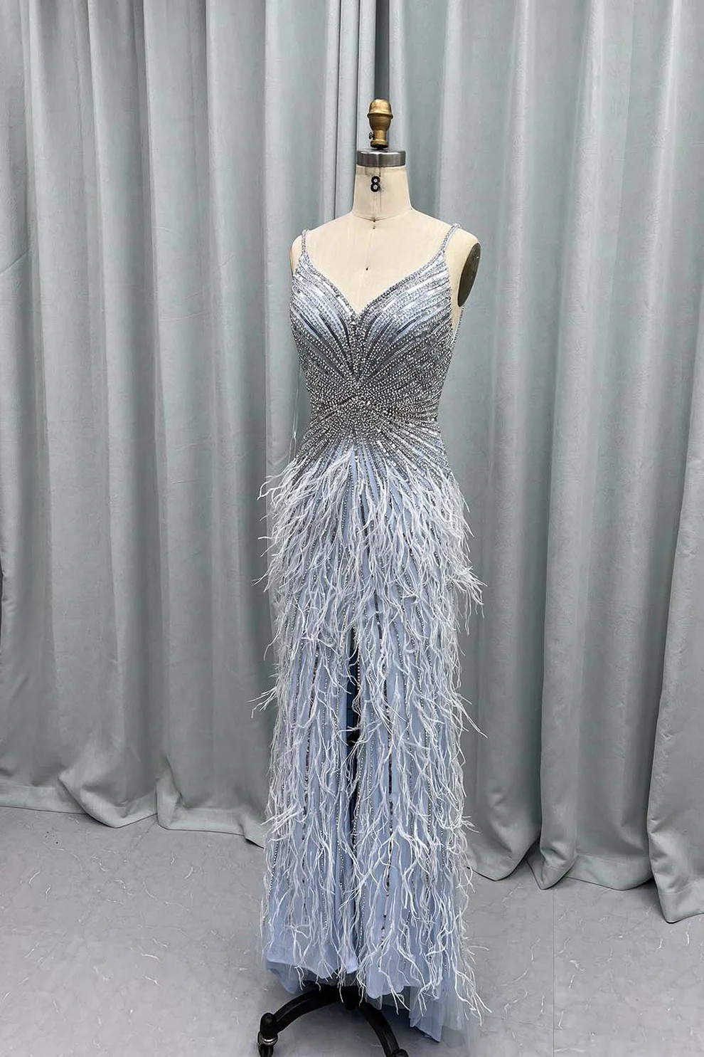 Crystal Feather Strapless Long Cocktail Dress C250529