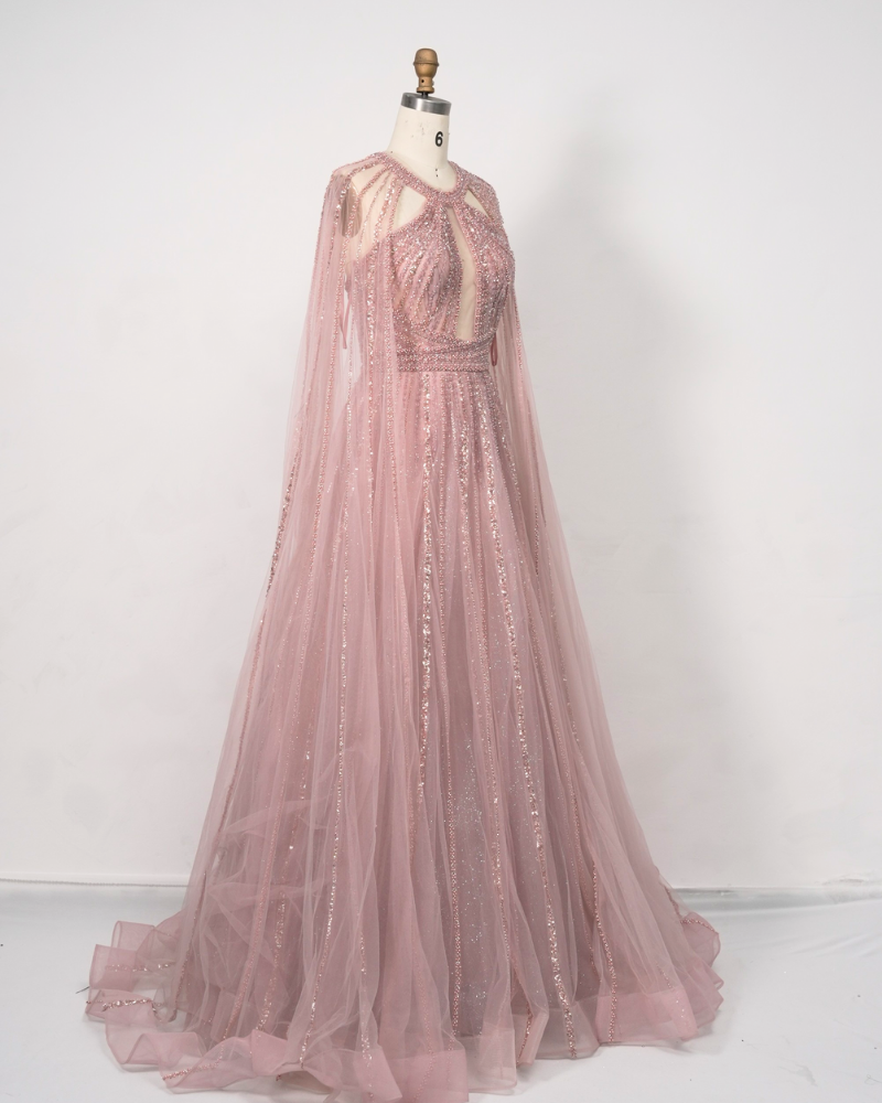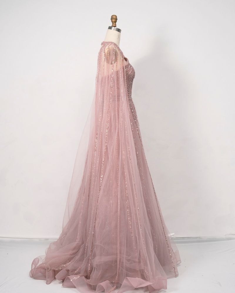 Pink Flutter Sleeve Long Cocktail Dress for Hosting & Banquets C250533